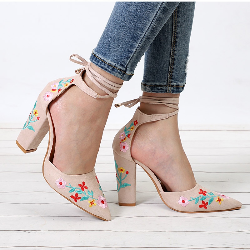 Women High Heels Plus Size Embroidery Pumps Flower Ankle Strap Shoes Female Two Piece Sexy Party Wedding Pointed Toe Worldwide Shipping