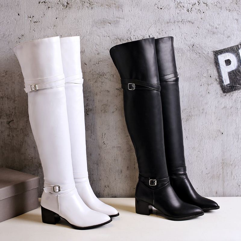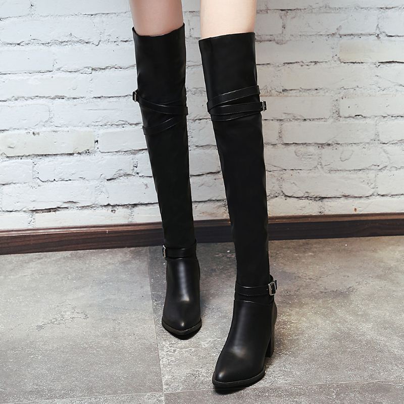 Over The Knee Boots Winter Warm Square Heels Shoes Woman Pointed Toe Pu Leather