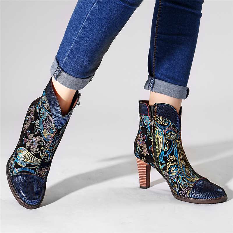 Brand Name: SocofyUpper Material: Genuine LeatherUpper-Genuine Leather Type: SheepskinBoot Height: AnkleFit: Fits true to size, take your normal sizeToe Shape: Round ToeSeason: Spring/AutumnClosure Type: ZIPis_handmade: YesPattern Type: PrintItem Type: BootsHeel Type: Square heelBoot Type: BasicInsole Material: PUShaft Material: Genuine LeatherShaft-Genuine Leather Type: SheepskinOutsole Material: RubberFashion Element: TOTEMLining Material: PUHeel Height: High (5cm-8cm)Model Number: SKUA52344With Platforms: YesPlatform Height: 0-3cmDepartment Name: AdultHeel Height: 8cmSeason: WinterStyle: Fashion RetroType1: zapatillas mujerType2: zapatos de mujer