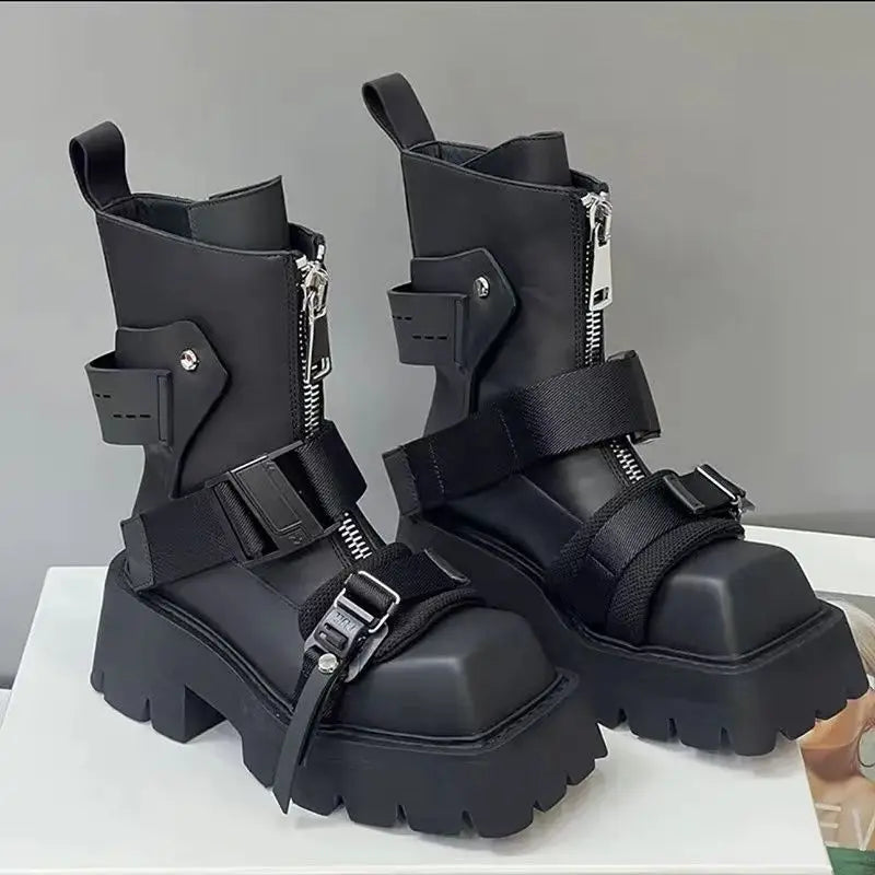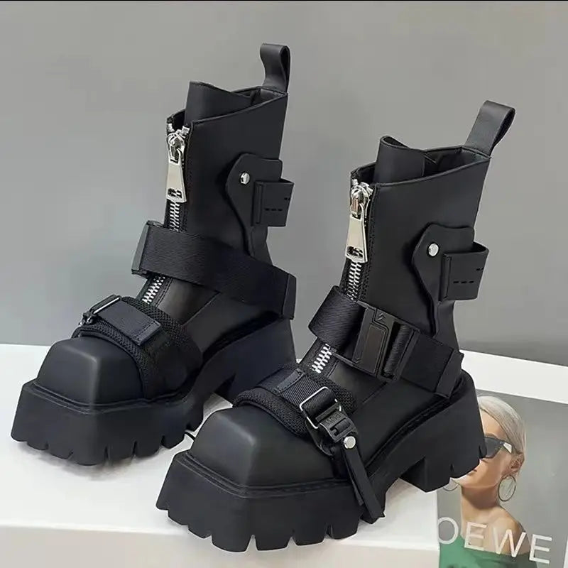 2025 Women Top Layer Cowhide Female Square Toe Western Front Zipper Color Matching Thick Bottom Belt Buckle Booties Chelsea